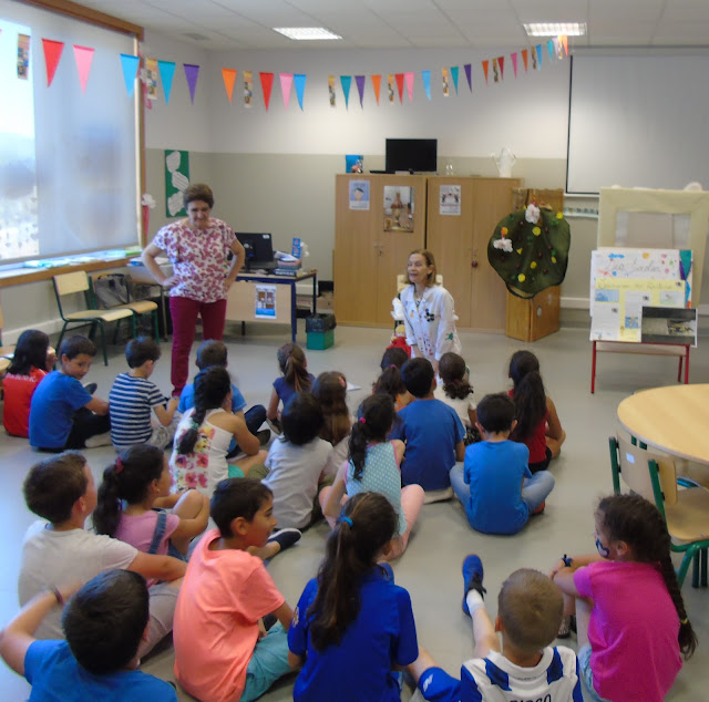 As crianças das 3 salas do JI ouviram e riram ao som do cacarejar da D. MARGARIDA e do PESCOÇO ALTO da OLÍMPIA que achava deliciosas as estrelas.